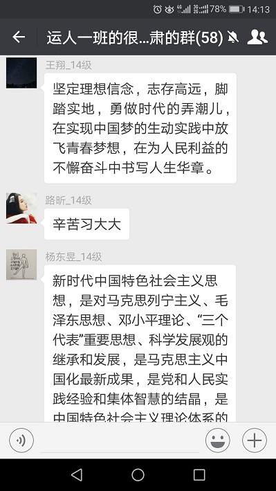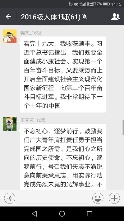 为了更好地引导学生的爱国热情,及时表达内心感受,又考虑到不耽误下午的上课,团总支书记、辅导员王鹏组织学生第一党支部和本科各年级以团支部为单位,进行了网上讨论学习。同学们对此次网上讨论表现出了极大热情,都积极踊跃在群内发言,讨论的内容多样,但都真挚热烈,对党和国家的热爱之情表露无遗。