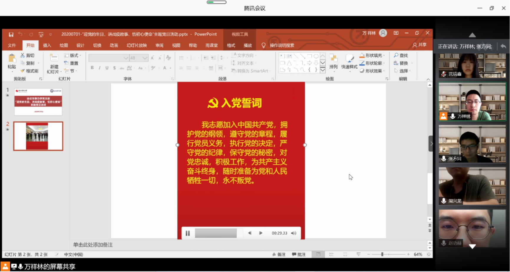 今天的党日活动主要进行了三项议程。第一项议程,党支部书记万祥林老师带领全体党员回顾了中国共产党的光荣历史。中国共产党自1921年成立至今,前有共产党员浴血奋战,今有共产党员坚守抗疫前线,发展的路上遭遇困难重重,但是一代代共产党员披荆斩棘、所向披靡。在党的带领下,全国各地党员同志们在自己擅长的领域前赴后继、不曾停歇过奋斗的步伐。