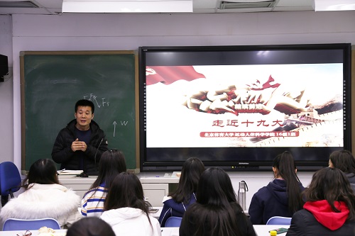 首先,团支部书记郭怡讲述了"走近十九大"团日活动的目的和意义。并带领同学们从党的十九大的主题、九个方面理论分析和政策指导、一个历史使命和"四个伟大"、两个重要时期和两个阶段、两个重大判断和一个重大思想、新时代坚持和发展中国特色社会主义的基本方略六个方面,解读了党的十九大报告蕴含的新主题、新思想、新成就、新时代、新矛盾、新目标、新任务、新要求。
