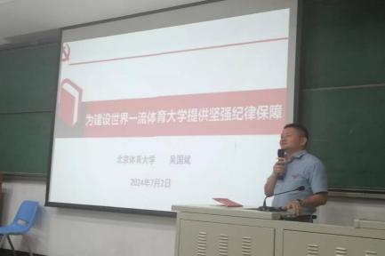 马克思主义学院吴国斌副教授以“为建设世界一流体育大学提供坚强纪律保障”为题,从《中国共产党纪律处分条例》修订的历史沿革谈起,从专业视角解读修订后的《中国共产党纪律处分条例》的主要内容,并结合体育系统典型腐败案例,鼓励广大师生要强化自我约束,促进担当作为,为加快建设中国特色世界一流体育大学提供坚强纪律保障。