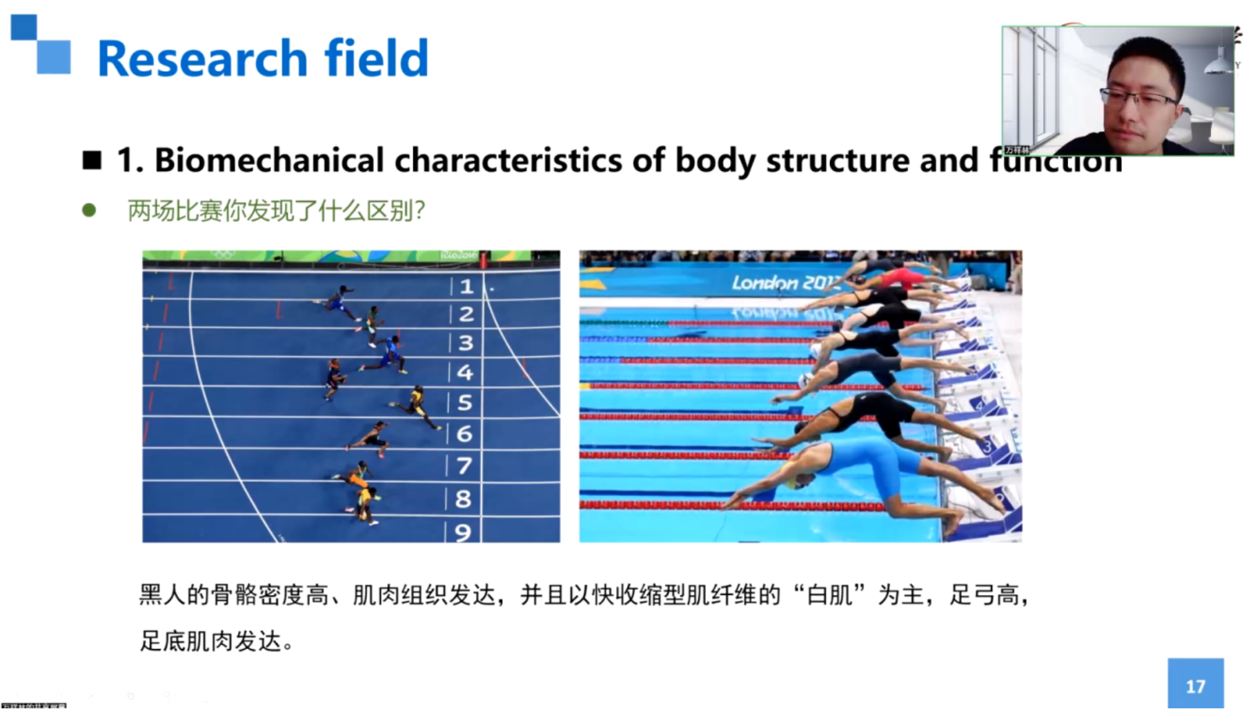 课堂讲授与互动:本次课程主要内容是运动生物力学的绪论,介绍成绩构成、教材、课程要求后,对学科定义及相关研究领域等内容进行了讲解。