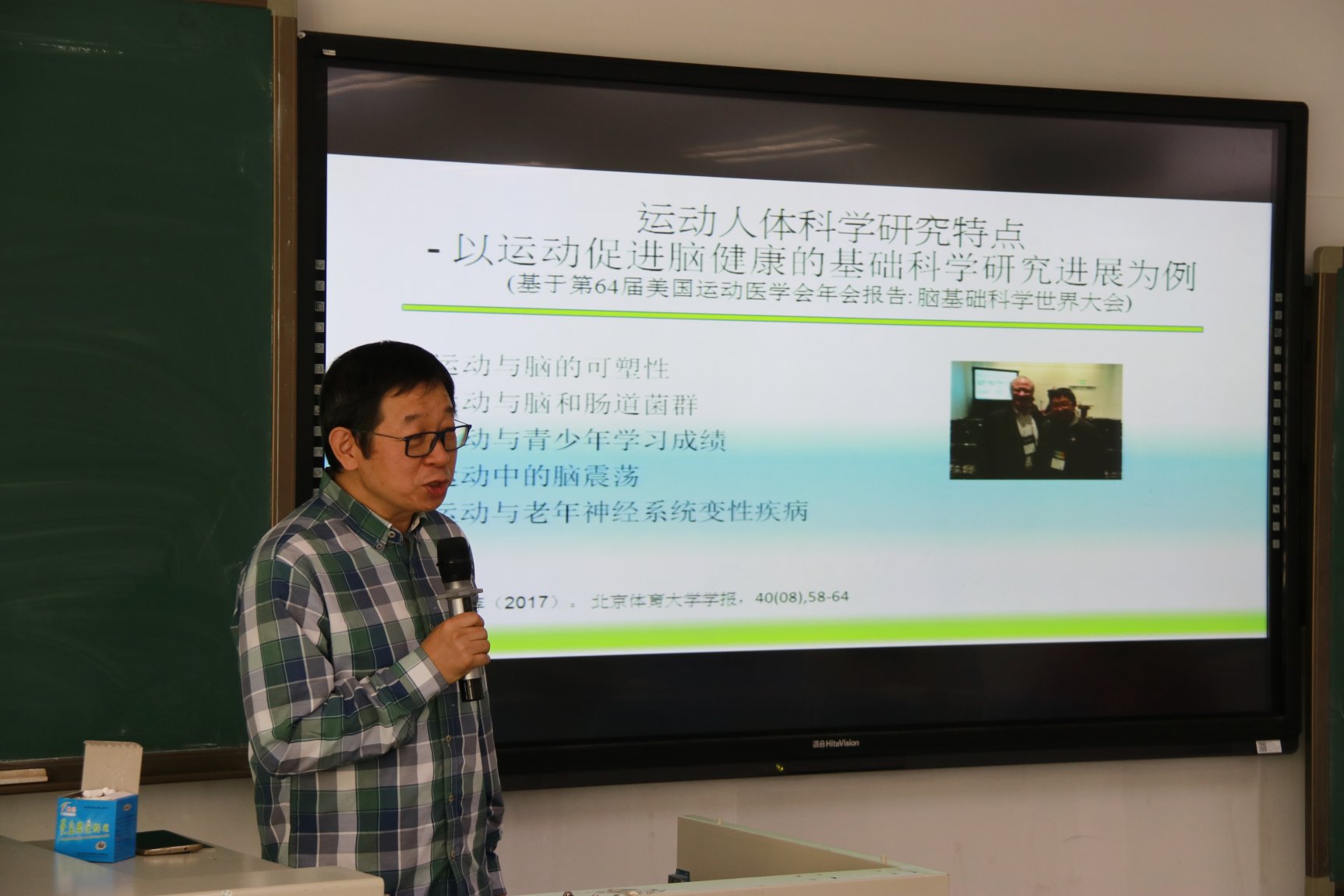 本次讲座,在关于运动人体科学研究方面,孔兆伟博士详细介绍了生理与运动医学领域的前沿创新成果,以运动促进脑健康的基础科学研究进展为例,分析运动人体科学研究特点;以2019ACSM《健康活跃生活方式的研究与实践》年会为例,讲解当前运动人体科学研究热点。他指出运动人体科学研究趋势具有“广度广”、“深度深”、“多交叉”和“跨学科”的特点,及时掌握科研动态,了解相关资讯对师生们开展选题和研究工作有极大的帮助。