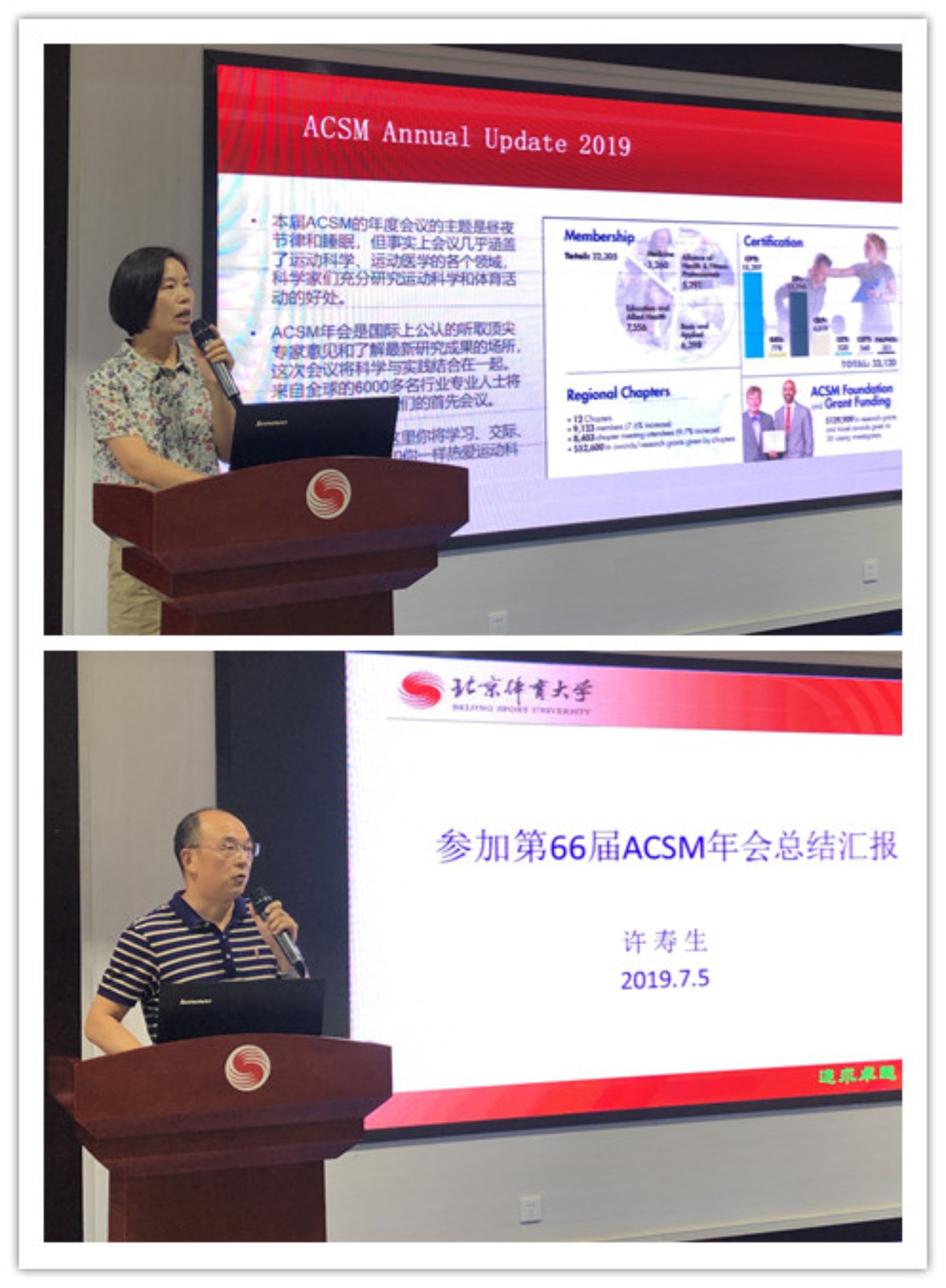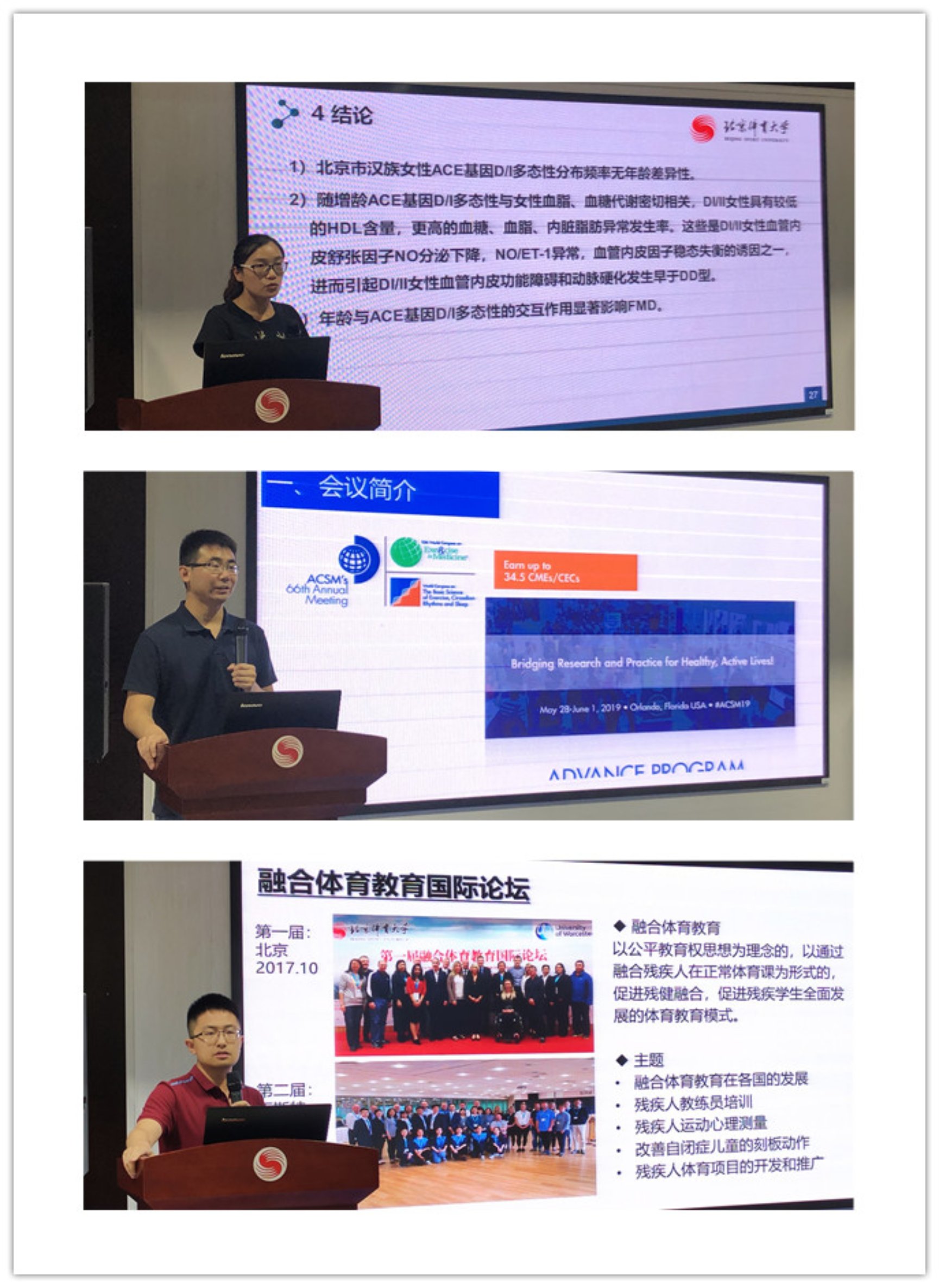 本次科研会,学院邀请运动生物化学教研室邱俊强教授、运动生理学教研室许寿生老师、李岩老师、中国健康研究院吕媛媛老师,演讲交流参加第66届ACSM年会的经验与收获,并且邀请运动生物力学教研室万祥林老师分享第二届融合体育教育国际论坛的参会经验。老师们分别展示了自己的参会总结,均表示这次年会是一个和国内外同行及专家交流学习的好机会。本次参会的经验和收获,对于学生和年轻教师更丰富地展示自己的科研和报告提供了指导;也对教师们备课和设计课程有很大启发;为学院师生提供了科学追随的榜样。老师们也表示学校和学院应重视出国交流学习的机会,加强对本科生、研究生以及青年学者的培养。