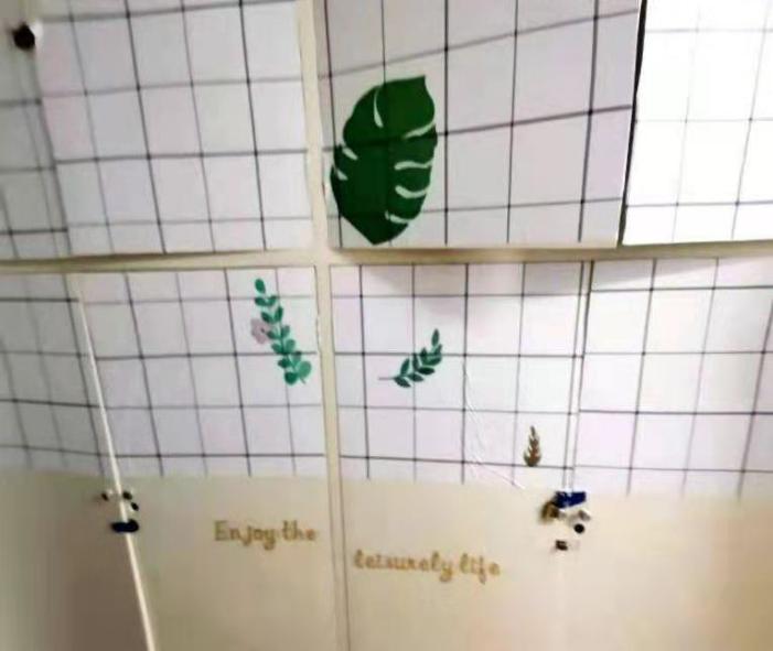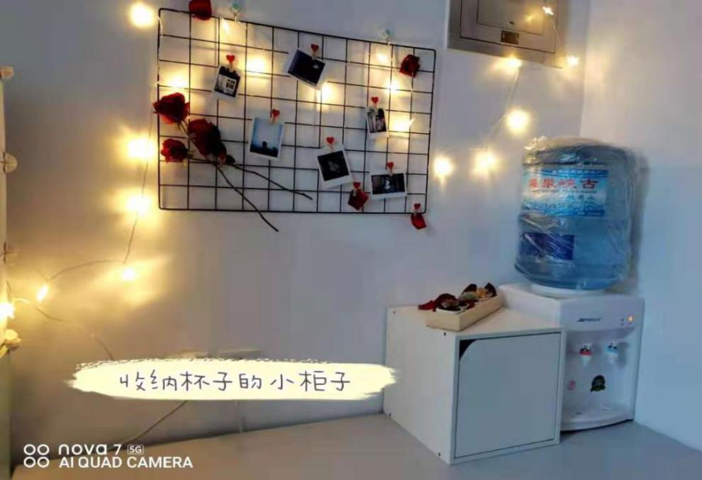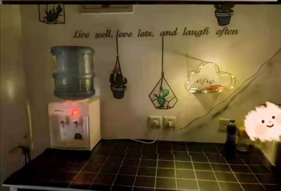 宿舍简介:单调的对立面就是无限,它非常牢固的牵扯着无限。就像没有边界循环的支点一样。门口的黑白相照,凸显304的独特。走进宿舍,抬头看似花灯排簇,像上元佳节,神武大街,花灯初遇,流连缱绻。而转头一看,衣柜上的泼毫点墨,落拓不羁,放荡自由,是骑马倚桥的鲜衣怒马少年郎。而再次回首,是那温馨的小灯,灯光碎了,粘连在墙上,撒了一室温柔,墙上的壁纸与他照相呼应,在这看似单调的区间里发挥无限的魅力。无限看似单调,其实炫丽而扑朔,没有人可以从单面定义它,因为无限本来就是永无止境的向前。而看似单调,实则留白,留下无限想象空间,成就孤独灿烂的星辰。