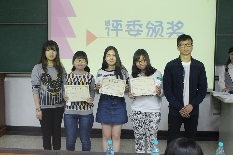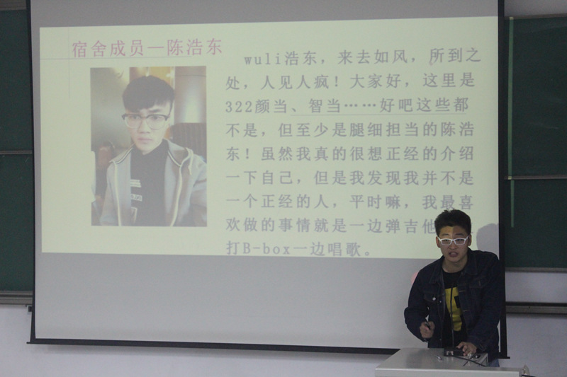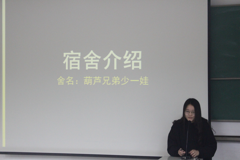 本次比赛共有19个宿舍报名参赛,经过20余天的精心设计,4月11日赵岩老师带队前往19个参赛宿舍进行现场打分,结合前期微信平台投票,共评选出前10个宿舍中参加决赛。主持人王一多介绍规则后,10个宿舍进入第一轮比拼。10个宿舍被分成5组两两PK,每个宿舍派一名代表通过视频或PPT的形式介绍自己的宿舍,并由现场观众投票选出每组的获胜方。其中,女生102宿舍充满生活气息的搞怪视频引发阵阵掌声,104宿舍艺术感十足、手绘与三原色混色而出的”梵的高“惊艳全场,男生322宿舍通过幽默的宿舍成员介绍和创意十足的宿舍展示给人留下了深刻印象。随后,5个晋级宿舍进行了第二轮PK。每个宿舍选出三人参与,主持人给出三道关于其中一名同学的问题,看三人的回答是否一致,以此考验室友间的了解程度,最终女生104宿舍和男生322宿舍获一等奖。比赛过程中气氛热烈,笑声连连,结束后进行了颁奖仪式。