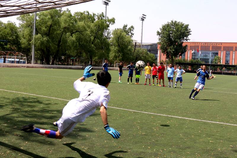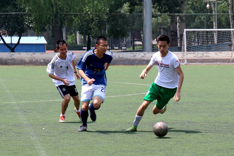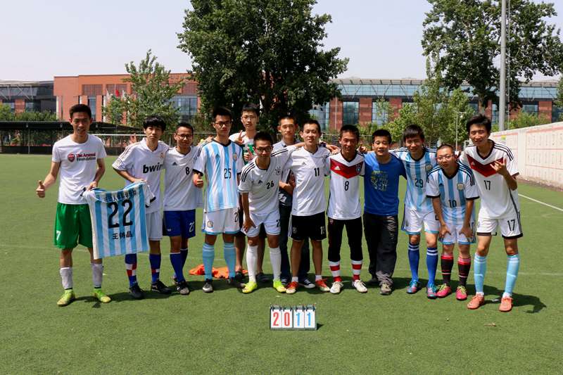 本场足球赛的对战双方是11级联队和12、13、14级联队。比赛开始,12级王蔚先声夺人,球门前接到队友传球,一脚捅射,洞穿球门。接下来11级蒋量和赵梦岩快速反击,接连射门连得三分。随后,加盟11级战队的13级焦亦飞左路突破,连过多名防守队员,将球打进。接下来12级宁旭琛、11级吴乐尧各进一球,上半场结束,11级联队5:2领先。易边再战,11级杨子鹏一记吊射,球跃过守门员,直击球门。几回合过后,12级宁旭琛再进一球,为其联队止住颓势。随后,杨子鹏开出一个落点极佳的角球,赵梦岩高高跃起,头槌破门。王鹏老师也参与到比赛中来,他积极跑动,精彩表现赢得场下阵阵掌声。比赛即将结束时14级倪彬门前解围,不料以手触球,11级王铸晶点球得分。最终,11级联队8:3取得胜利。