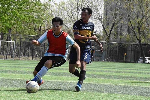 4月11日中午12点,我院足球队于足球四号场迎来了校联赛小组赛的首场比赛。对阵双方为taptap点点足彩和国际教育学院。