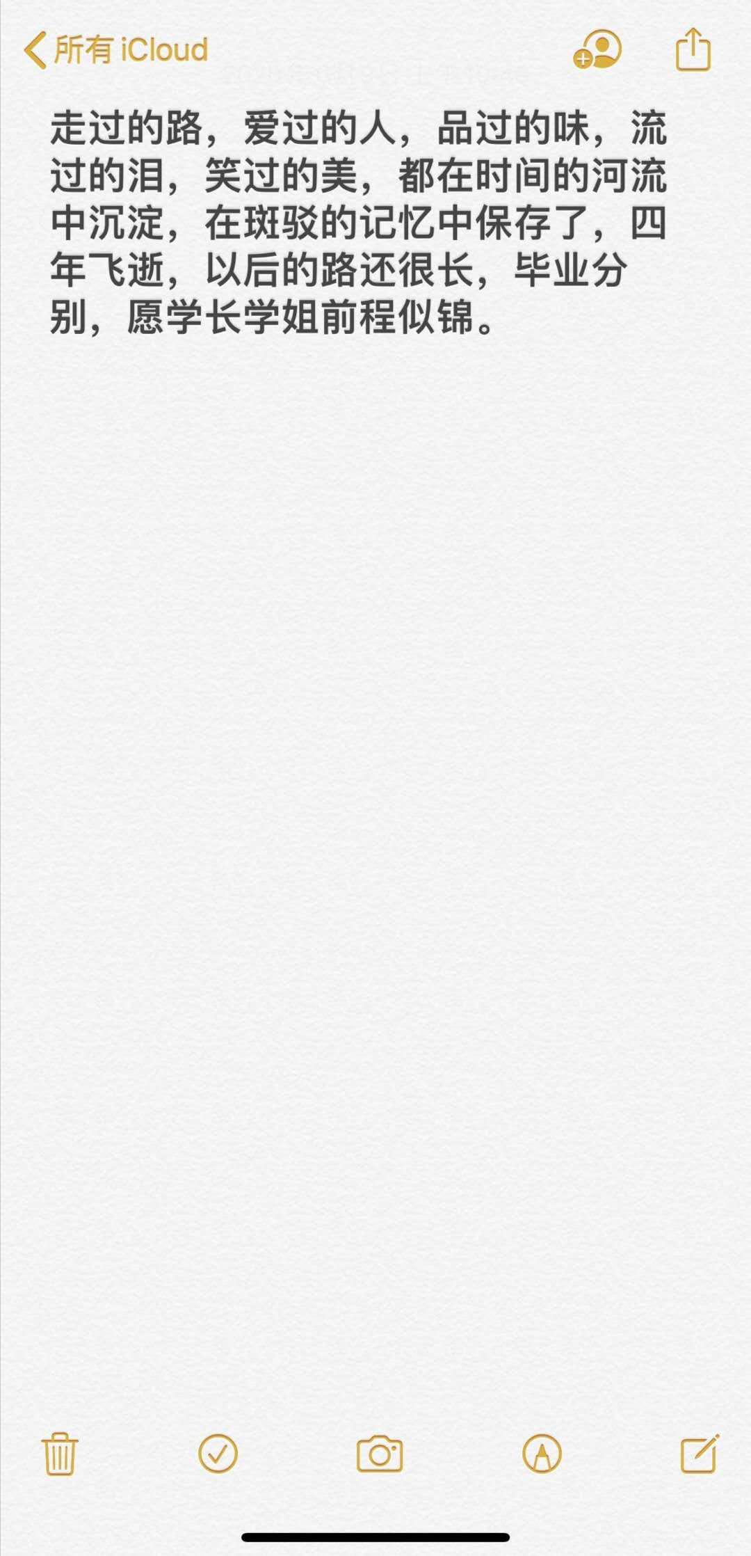 学长学姐:毕业快乐!从五湖四海来,到天南地北去,你们即将离开这所学校,开启自己人生新的一段生活,祝你们在新的人生新的道路上有新的开始,能够一帆风顺!但学长学姐也要记得多回来看看。