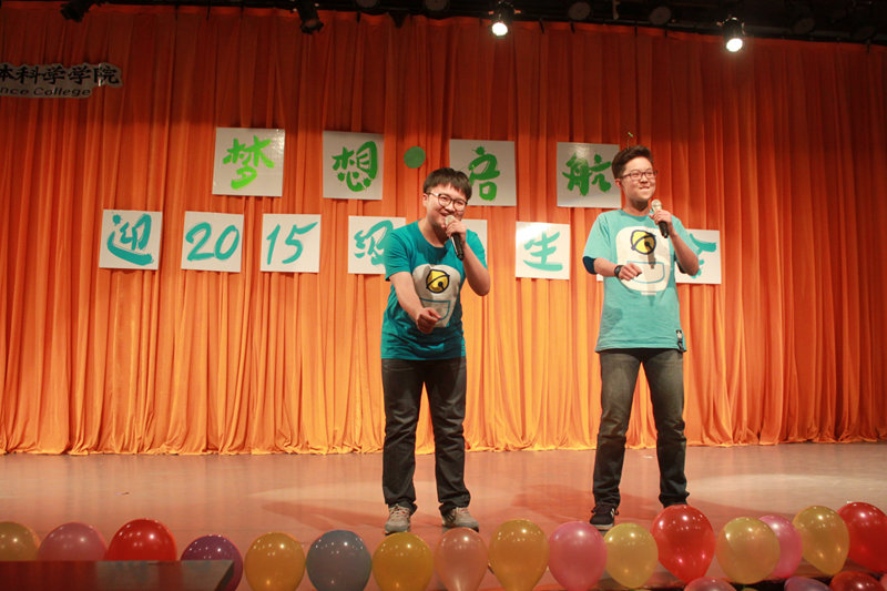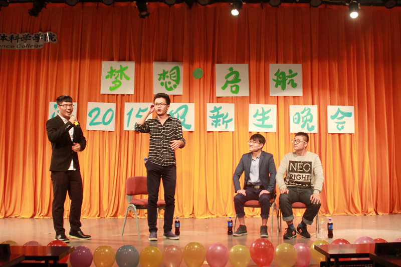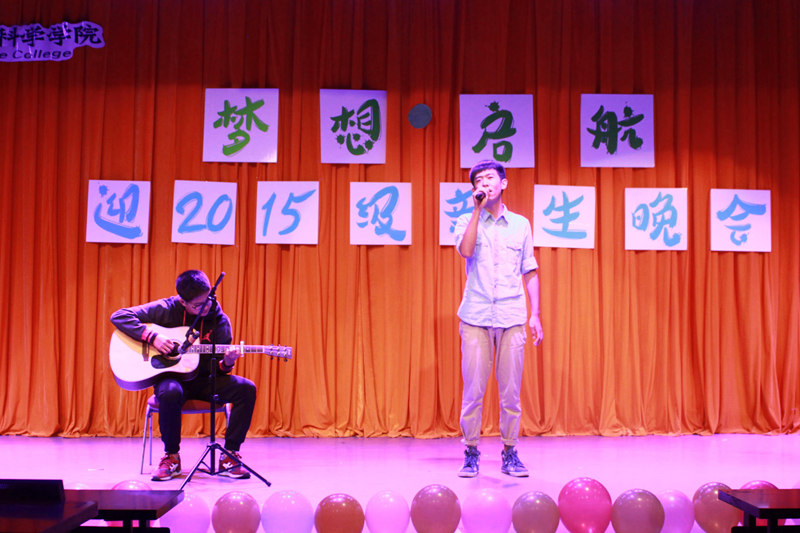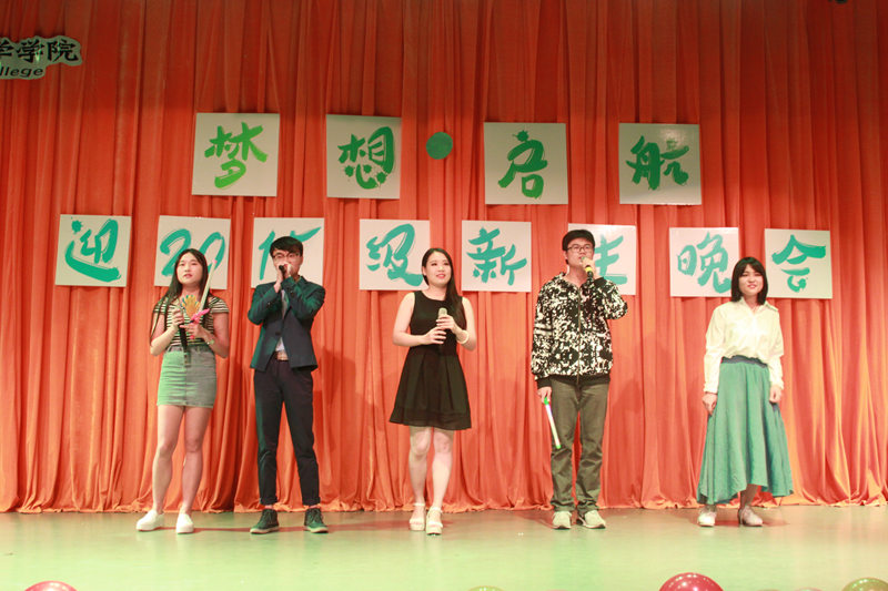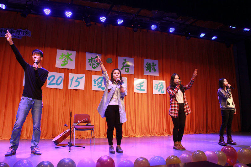 灯光变暗,开学以来的一幕幕在荧幕上闪过,宣传部精心制作的短片将大家带回了初入大学的那段时光。紧接着来自荆棘谷乐队的《一起摇摆》迅速点燃全场,满场欢呼中,邹英皓、王一多、鲁典、刘卓林四位主持人靓丽登场,晚会正式开始。尤克里里演奏《弹唱青春》的乐声扬扬带着晚会缓缓走向高潮。接下来的脱口秀《开学第一天》风趣幽默,喜感满满,头上“长草”的两位演员结合了方言和潮言潮语,以丰富的动作形象的展现出了新生对于大学生活的适应过程,“今天这水龙头有点狂躁啊”、“这脸型,真是‘大连、太原’”等等,满口的东北方言让场下笑声不断,掌声如潮。诗朗诵《雁又何往》伴音乐而起,琴声笛韵悠悠袅袅,舞一席衣袂飘飘,不知牵起场下人几缕思乡。爵士舞《shaking box》,情深悠长的音乐剧《我心永恒》,打动全场的吉他弹唱《南山南》,还有充满青春朝气的歌曲串烧《追梦之路》……整场晚会高潮迭起,精彩纷呈。观看搞笑花絮后,全体嘉宾、演职人员上台合影留念,为晚会留下了完美的句号。