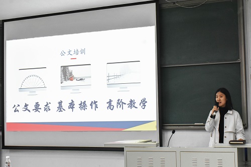 活动伊始,侯榕芳老师对参加培训的全体学生会成员提出了积极表达想法,乐于学习进步的建议和期望。接下来,院学生会办公室主任吕佳倪为同学们进行了此次公文培训。培训内容主要包括编辑个人简历,制定活动策划和撰写活动总结三个方面,此外还有办公软件的使用技巧以及常用快捷键的总结。吕佳倪从理论出发,结合自身学习和实践的经验,向大家展示了多种公文的优秀模板,细致入微地阐释了公文撰写的方法要领及注意事项,使在场同学收获颇丰。最后,学生会副主席谭宇潇对此次活动进行了点评,建议同学们认真学习消化培训内容,切实提高编写公文的能力。