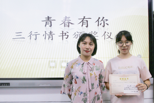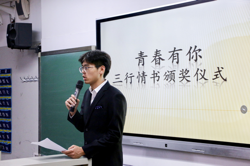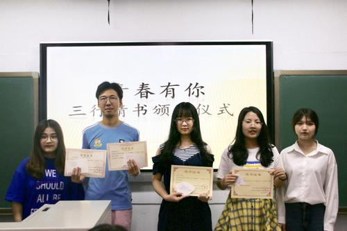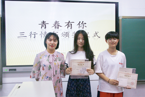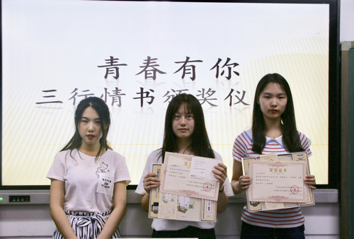 至此,第三届“青春有你·三行情书”大赛颁奖仪式圆满结束。本次活动丰富了同学们的课余生活,让每位同学都有机会诗意地表达自己的情感。青春有你,所以不悔,执笔三行,为你成诗。当灼灼阳光透过树叶的间隙散落在绿得透亮的青草上,你也许就会想到一个想与之分享柠檬味气泡水的人。拿起笔来,将那美好的悸动化成诗吧。悸动不会停止,我们的故事永远未完待续。让我们期待下届三行情书大赛的到来吧。