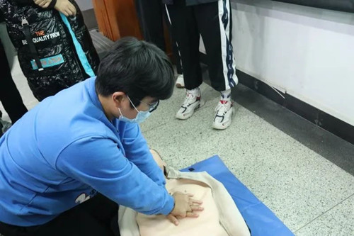 理论介绍完毕,杨永龙还带领同学们体验了模拟胸外心脏按压活动,极大地激发了同学们的兴趣与热情。同学们纷纷上前,争相体验施救流程,在体验过程中,杨永龙亲自演示实际操作并且随时纠正同学们的动作规范,认真帮助每一位同学切实掌握这项重要而又必要的技能。