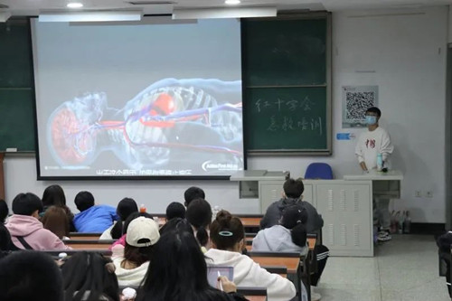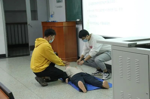 本次培训,杨永龙主要为同学们讲解了四项主要技能,即“胸外心脏按压”“人工呼吸”“心肺复苏术”“海姆立克急救法”。在杨永龙简明扼要而又细致耐心的讲解下,同学们学习到了每一项技能的正确操作方法以及注意事项。除了专业的理论介绍,杨永龙还根据个人经验,结合现实情境,使以上急救知识更具有现实意义,便于大家更好地掌握并能够付诸于实践。此外,杨永龙还为同学们准备了精美清晰的模拟视频,便于同学们更精准地用科学的方法进行急救操作。