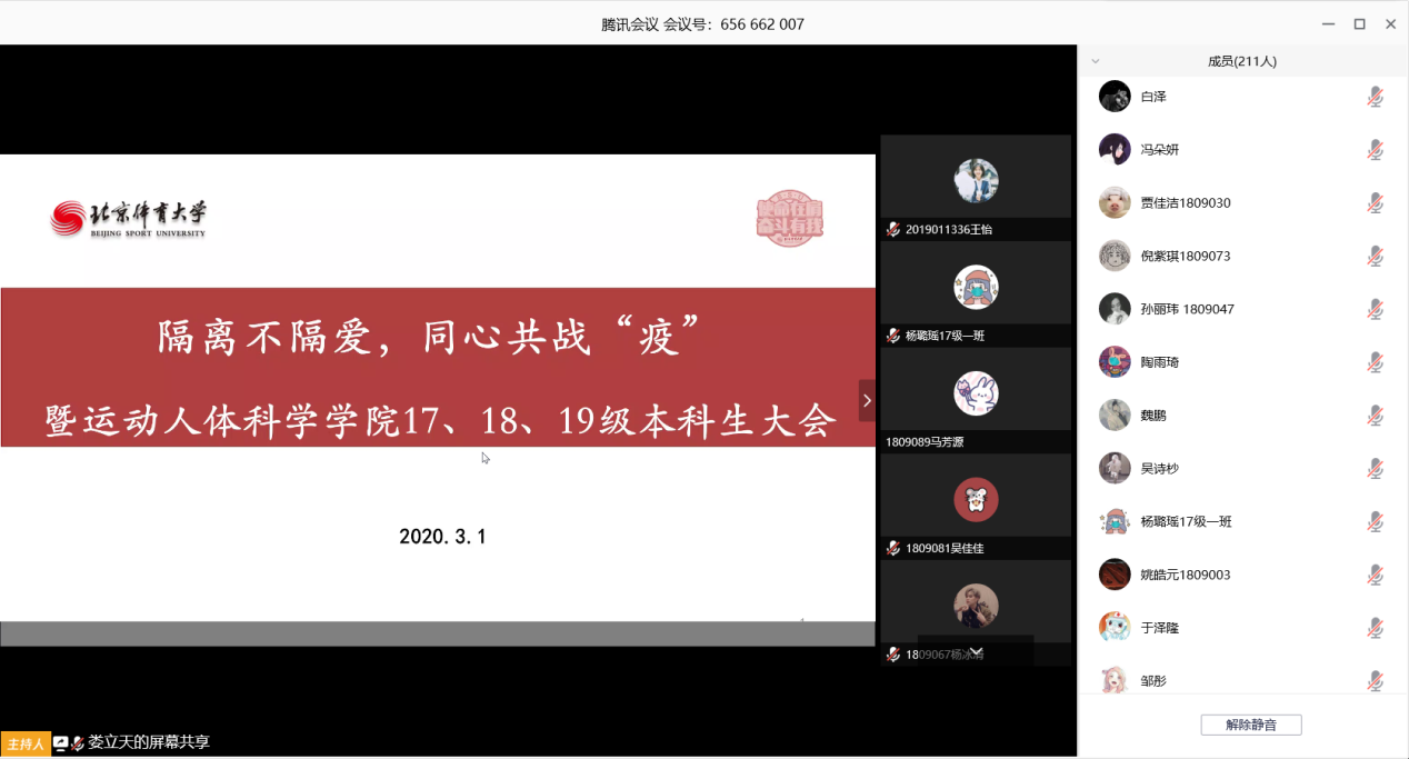 新学期新开始,taptap点点足彩于2020年3月1日上午10:30通过腾讯会议以“隔离不隔爱,同心共战’疫’ ”为题召开了2017级、2018级、2019级本科生线上会议。本次会议由学院团总支书记娄立天老师主持,学院分党委书记雷厉、院长王荣辉,副院长于亮,院长助理赵星、辅导员刘鸿瑞、教务员高超、学生助管姚晨曦出席会议,共286名学生参会。