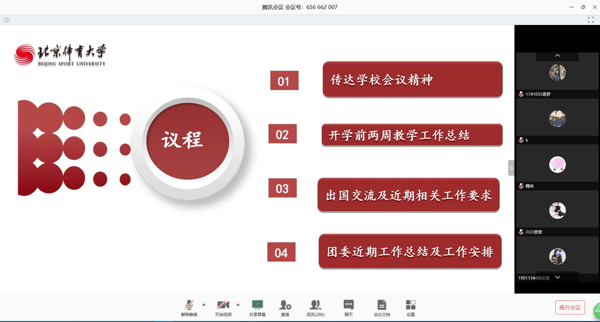 第四项由娄立天老师就团委近期工作做出总结和工作安排;他总结了防控期间各年级团支部开展的各项工作,对各位同学以高标准完成工作表示肯定;下一步希望全体团员担负起时代赋予自己的责任,拿出“只争朝夕,不负韶华”的精神,在疫情防控期间,落实好团委的各项工作,发出青春之声,为湖北加油,为祖国加油!