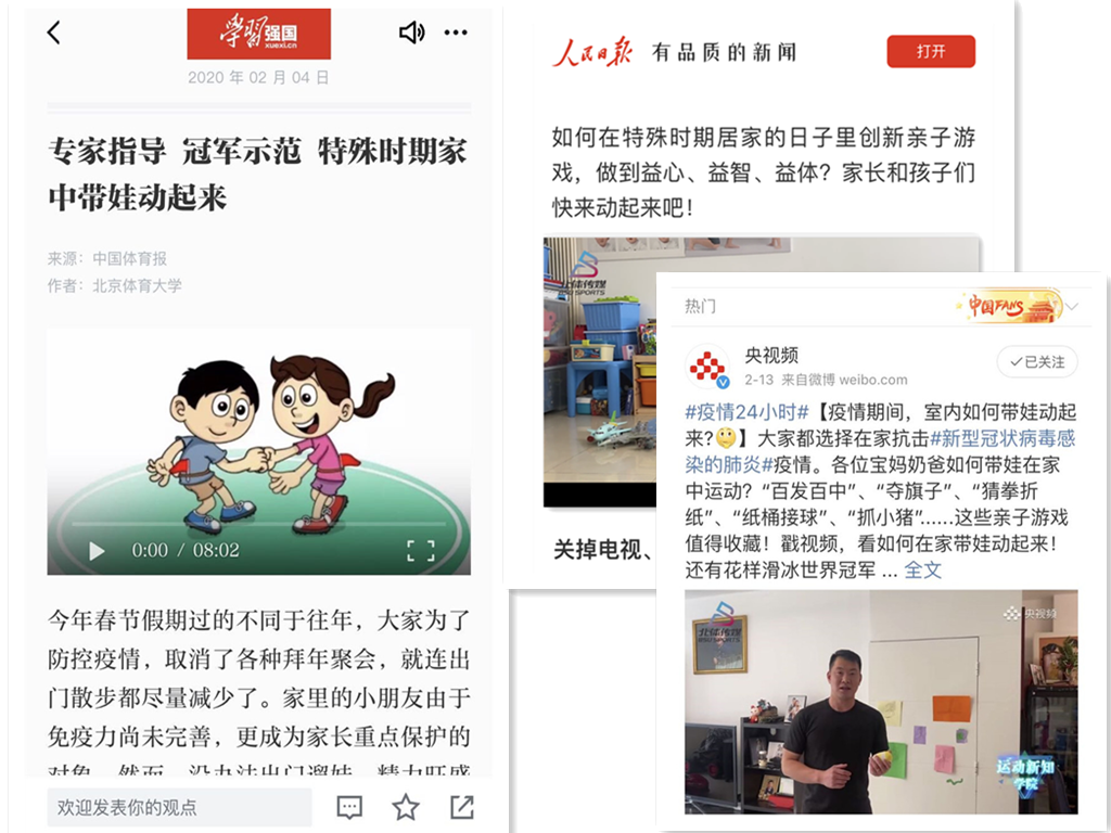 前三期文章一经推出,就被学习强国、人民日报、人民网和中国妇女网等10余家媒体转载和报道,累计阅读人数超过50万。由花样滑冰世界冠军张昊示范的亲子运动游戏视频在北体传媒微博上线后,一日内观看量就达到16.8万。网友们纷纷评论:“这对孩子身体好,减轻寂寞,所有的孩子在家里头都玩起来吧”、“爸妈再也不用担心我不会带弟弟了”。