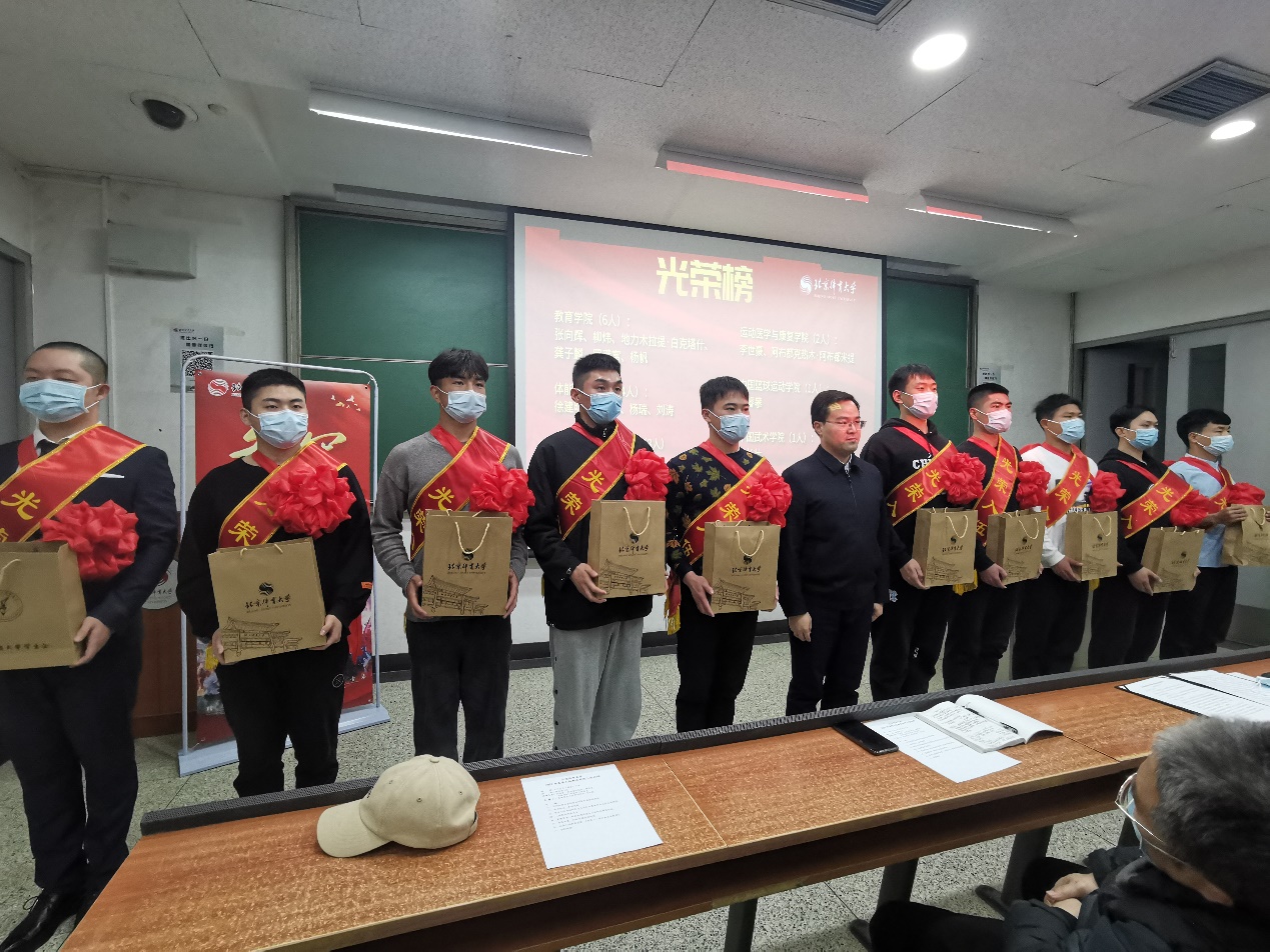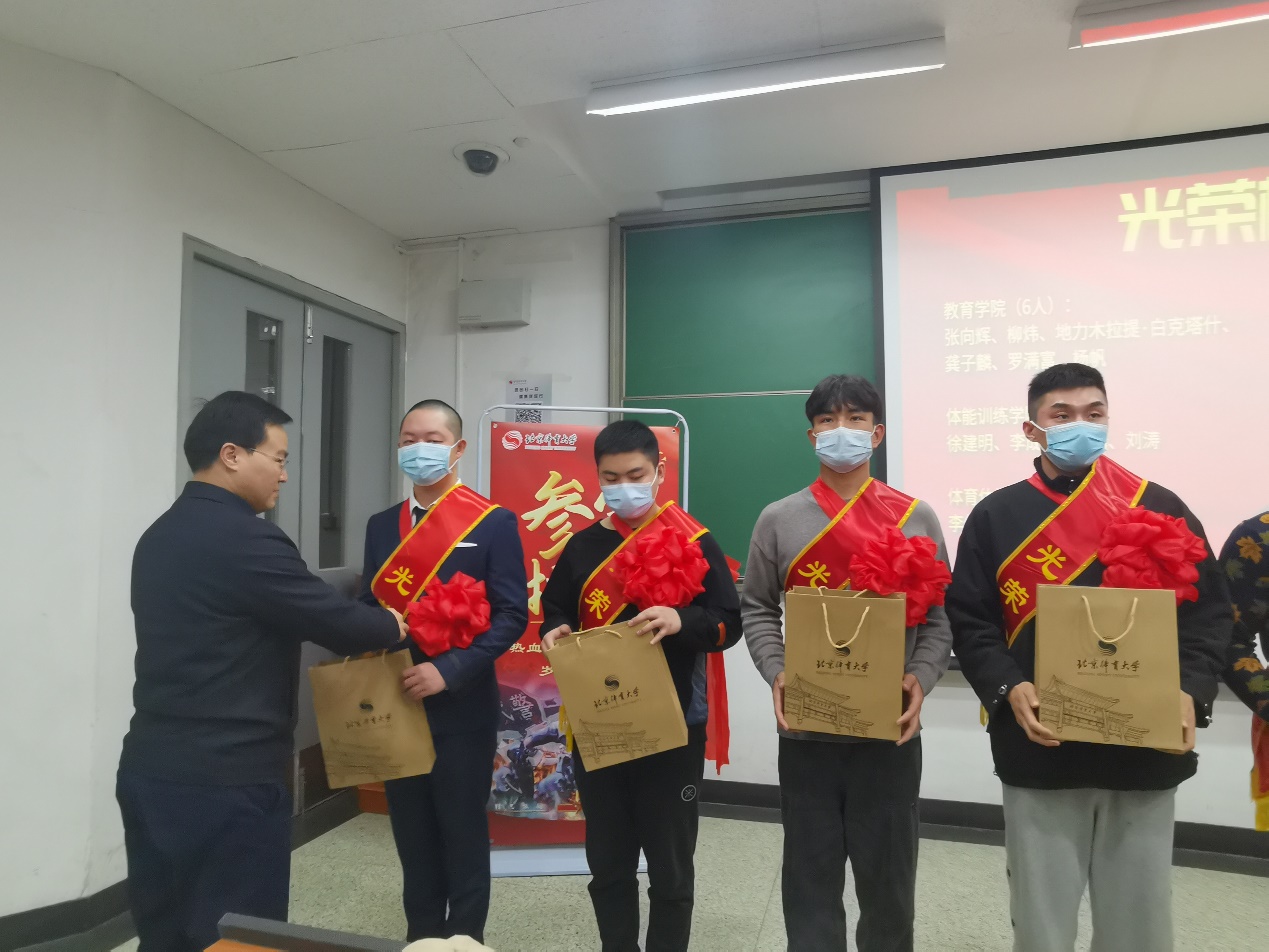 会上学生工作部副部长刁艾莉介绍了2021年春季征兵工作的相关情况。随后,党委常委、副校长周启迪代表学校为入伍新兵赠送纪念品并合影留念,同时也对即将奔赴军营的同学们进行嘱托,叮嘱他们不忘初心和理想,把小我融入大我,练就过硬本领,投身强国伟业,传承北体精神,励志报效祖国。