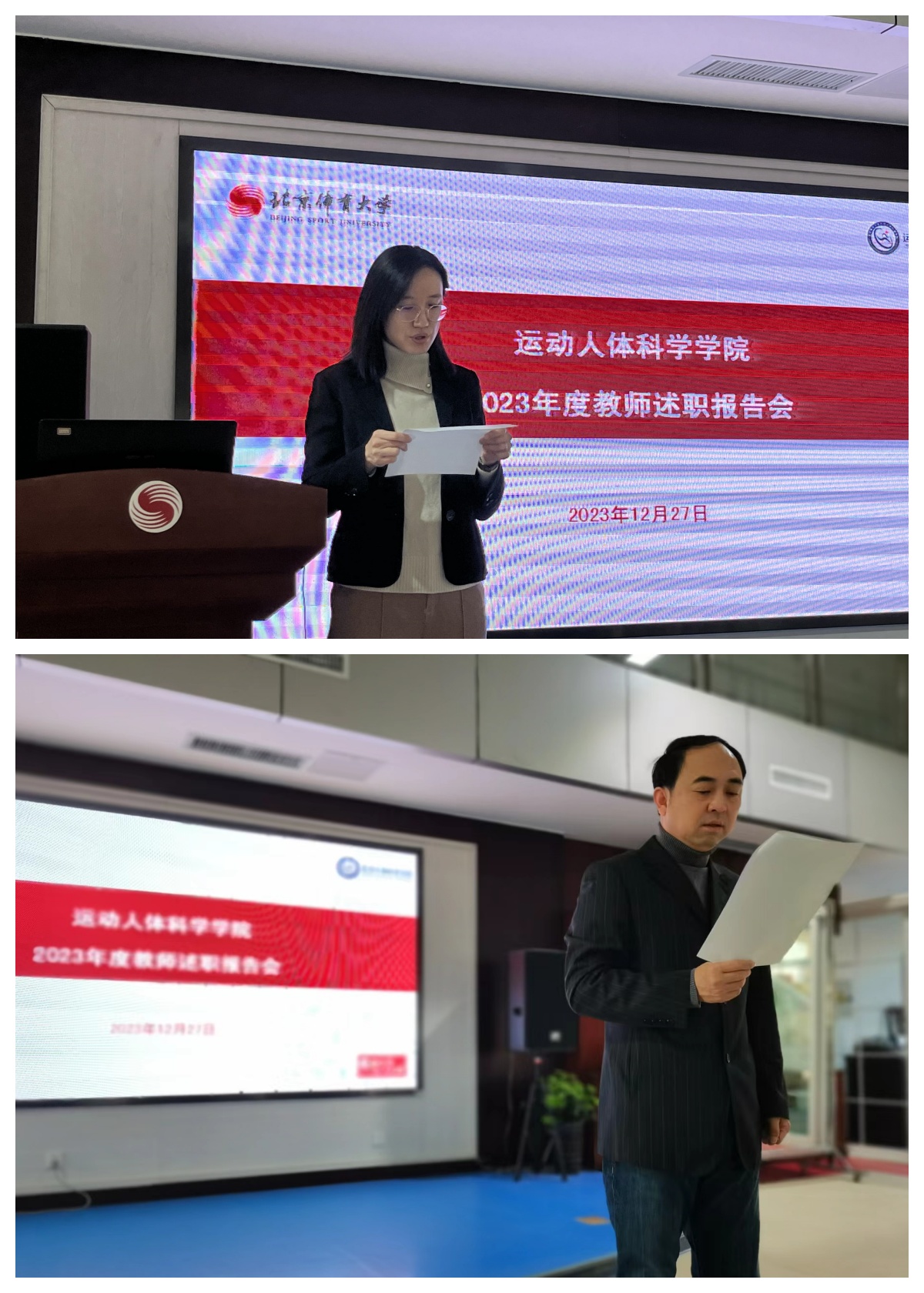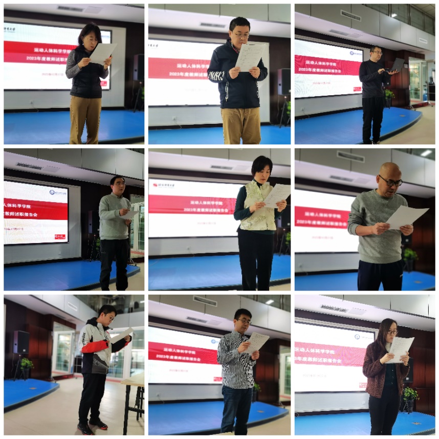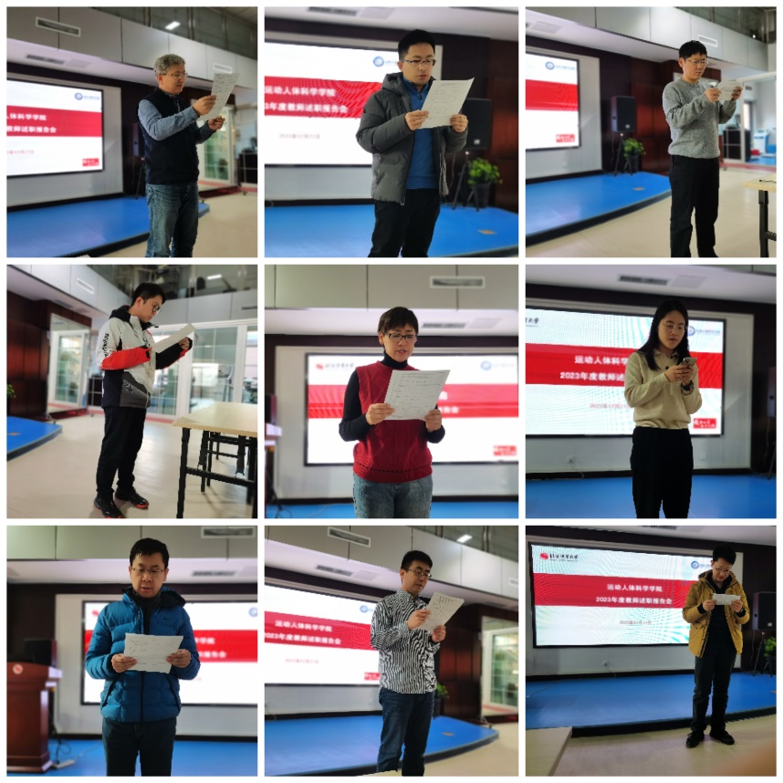 会上,我院运动解剖学、运动生理学、运动生物化学、运动生物力学及体质与健康教研室共37名教授和副教授,包括运动人体科学方向的双肩挑老师,上台逐一进行了述职。他们从思想政治、教学成绩、科研成果、社会服务等方面进行了个人的年度工作总结,并分享了自己的心得和感悟。