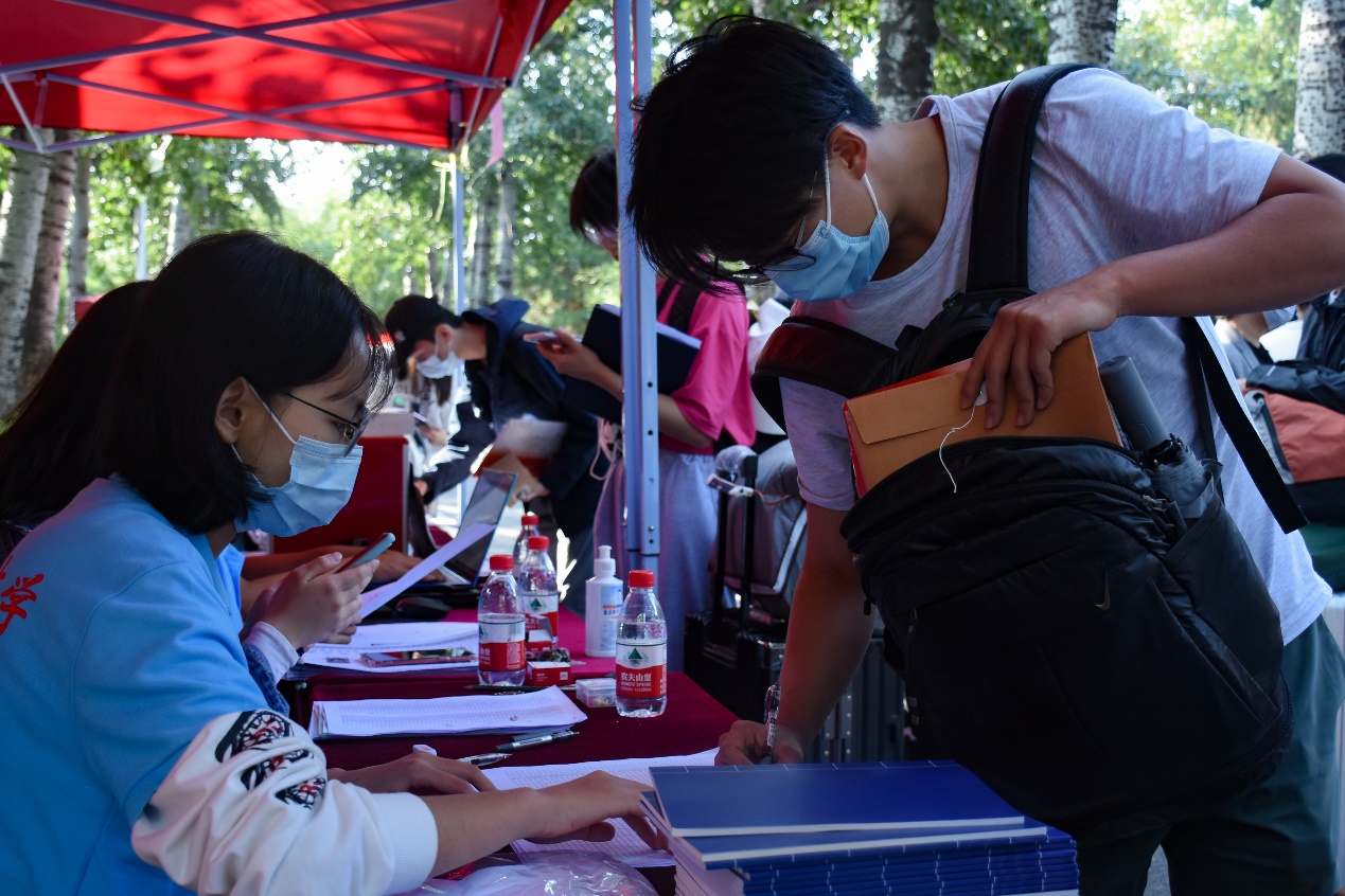 他们拖着载满父母期待和嘱托的行李箱走进了校园,遇到了早早就在学院迎新点前等候的学长学姐。他们热情细心的帮新同学**登记手续,保证每一位同学都顺利报到!