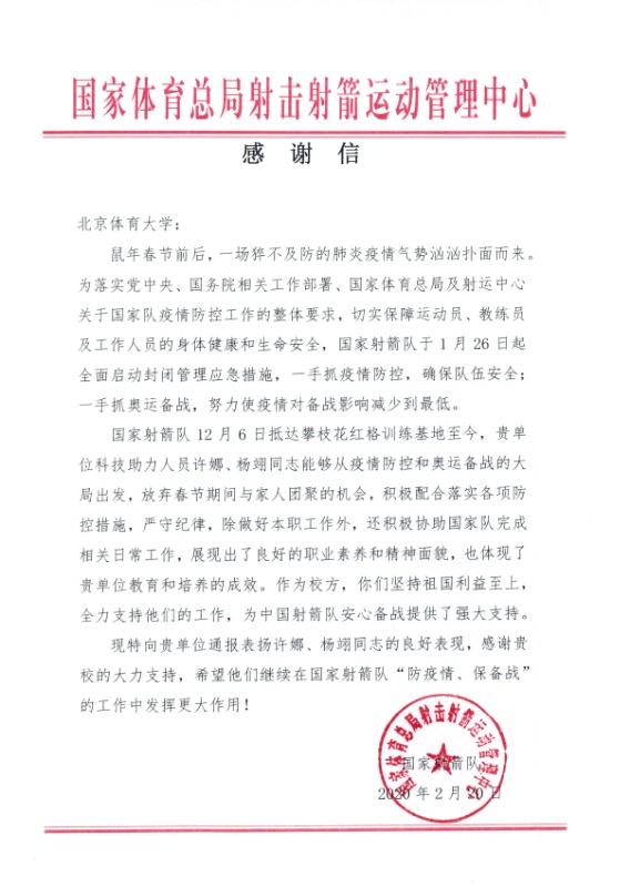 由于新型冠状病毒疫情的爆发,原本回家过年的计划被紧急取消。面对疫情,作为taptap竞彩足球的研究生,作为备战国家队的一分子,杨翊同学始终认为应当把队伍利益放在第一位,遵守国家和队伍的封闭管理制度,在整个春节期间留守国家队,积极开展防疫工作。除完成好本职工作外,该同学在疫情期间帮助队伍与外来人员进行对接,包括物资采购、场地管理等,尽自己所能保护自己,保护国家队。鉴于该同学的良好职业素养和表现,国家射击射箭运动管理中心专门给学校发来感谢信,希望杨翊在“防疫情,保备战”工作中发挥更大的作用。