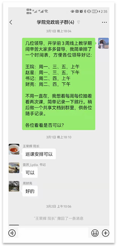 为了持续提升在线教学效果,为在线教学常态化提供质量保障,制定了“学院班子-教务员、辅导员”对接制度以及学院在线督导工作方案,积极落实在线听课督导工作。班子4人在随机抽检之外,同时安排“值日”制度,并采用在线共享文档随时做好记录。保证每位班子成员每周听课2-3次,及时了解本院师生授课、到课情况。一旦发现问题可及时与辅导员、教务员进行反馈,保障在线教学督导工作顺利开展。