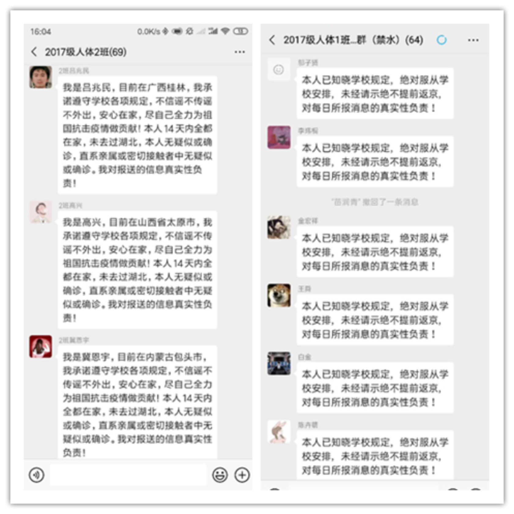 疫情就是命令,防护就是责任,作为大学生中的普通一员,首要做的就是采取科学有效的方法预防疾病传染,保护好自己和家人,发现发病情况及时报告相关医疗部门。在学院辅导员的组织下,2017级全体成员自2月10日起,坚持每日在班群内汇报个人及家人健康情况;微信小程序中完成每日签到;每日按时发送个人所在位置定位,承诺“遵守学校各项规定,不信谣、不传谣、不外出,安心在家,尽自己全力为祖国抗击疫情做贡献”,顺利完成校学工部组织的“我承诺、我报道、我接力”线上活动。