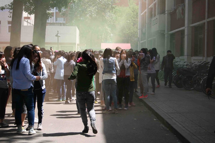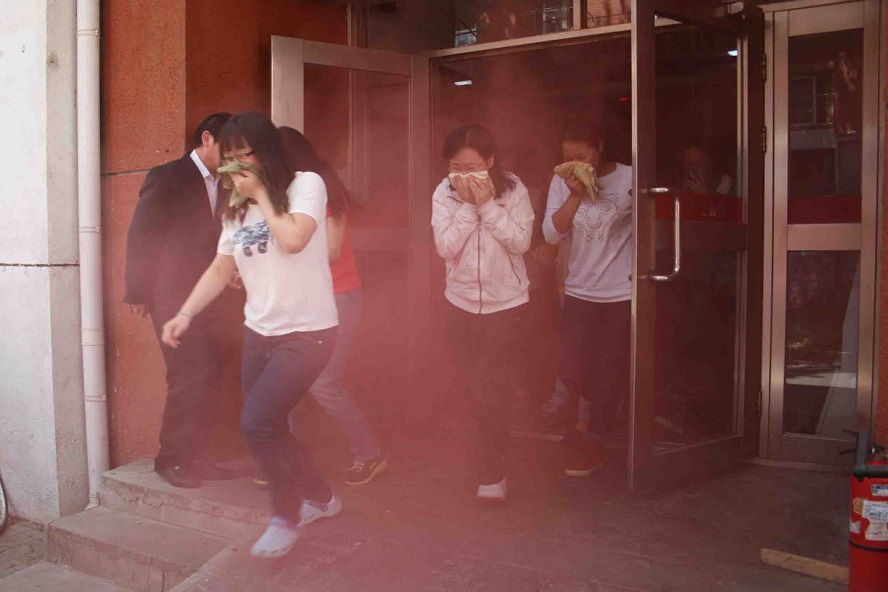 为了使活动达到更好的效果,保卫部(处)制定了周密的安全疏散演习方案。疏散演习前,保卫部(处)的老师首先向参加演习的同学宣传安全常识,并强调在演练过程中应注意保持镇静,不要出现推搡等现象,安全员在演练过程中要各负其责,确保演练安全。随后演习正式开始,当警报声响起时,安全员不间断地吹哨,为了使演习更加真实,演习中使用了烟雾弹。全体学生迅速而有序地疏散。在演习过程中,学生严格遵守自救基本动作规范,双手用湿毛巾紧捂口鼻,并且按照安全指示灯的指引,迅速有序地撤离宿舍楼,在一分钟内到达空旷的场地集合。