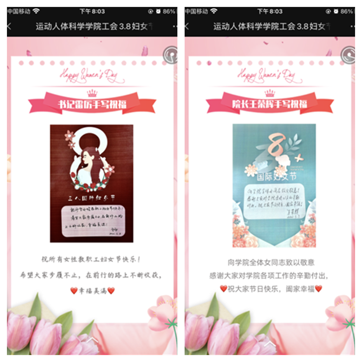 3月8日上午,学院工会制作精美的“三八”国际妇女节线上H5祝福贺卡,学院分党委书记雷厉、院长王荣辉也手写贺卡放入其中,将美好的祝愿传递给每位女性教职员工。