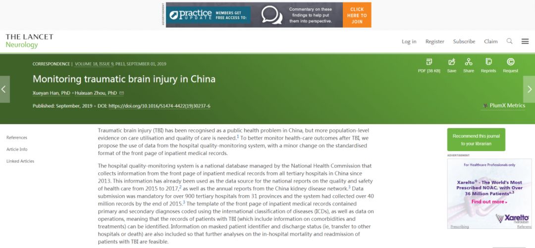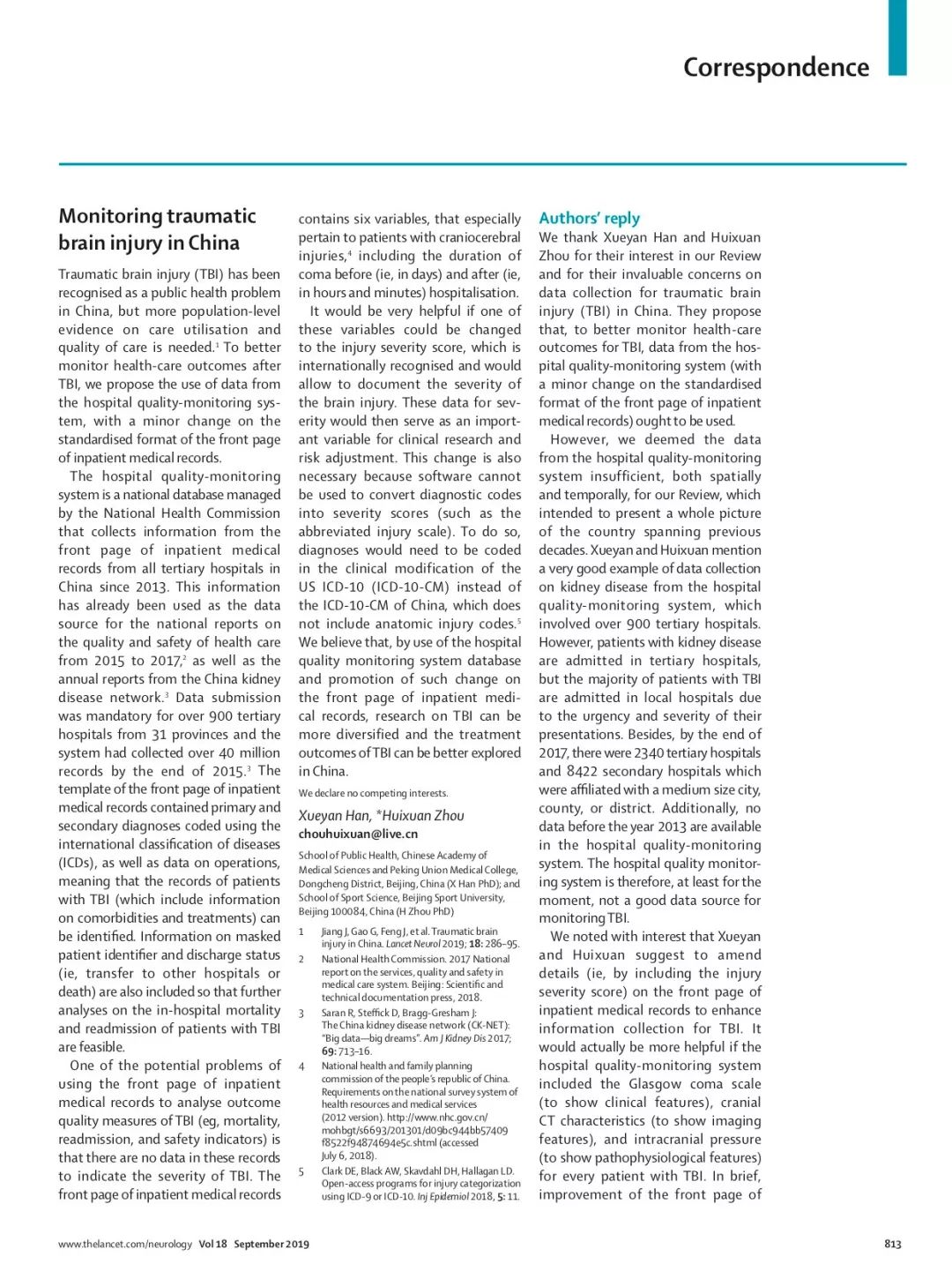 近日,我校taptap点点足彩青年教师周惠宣博士以通讯作者身份在国际医学权威期刊《柳叶刀神经病学》(The Lancet Neurology)发表评论性文章《监测中国颅脑外伤》(Monitoring traumatic brain injury in China),影响因子达28.7。