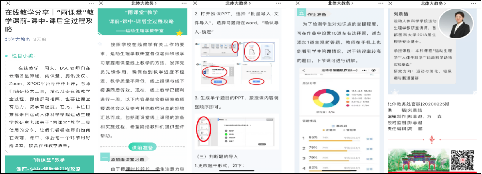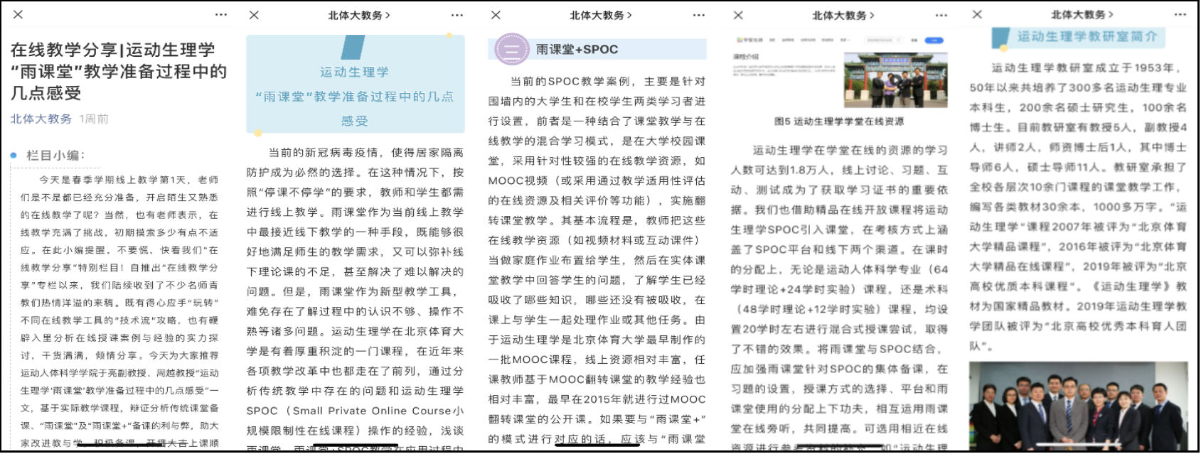 按照学校在线教学有关工作的要求,运动生理学教研室所有老师为实现线上教学、保证正常教育教学秩序,都积极学习掌握雨课堂线上教学的方法,相互交流经验和学习心得,充分发挥党员先锋模范作用,确保做到教学进度不延迟,教学质量不降低,线上授课与线下授课同质等效。运动生理学“雨课堂”教学准备过程中的几点感受。于亮和周越老师积极向全校教师提供雨课堂、SPOC等教学经验分享,并发布于“北体大教务”公众号,并接受宣传部采访。