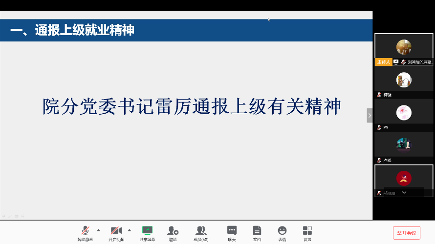 首先,雷厉书记传达了上级有关就业精神,总结了疫情期间学校的就业工作,并向学生解读北京各高校及学校关于就业工作的重要讲话,雷厉书记表示在疫情期间学校及学院的就业工作不停,要求响应学校号召认真落实就业工作,并希望毕业生树立正确的择业观,积极参加网络双选会。