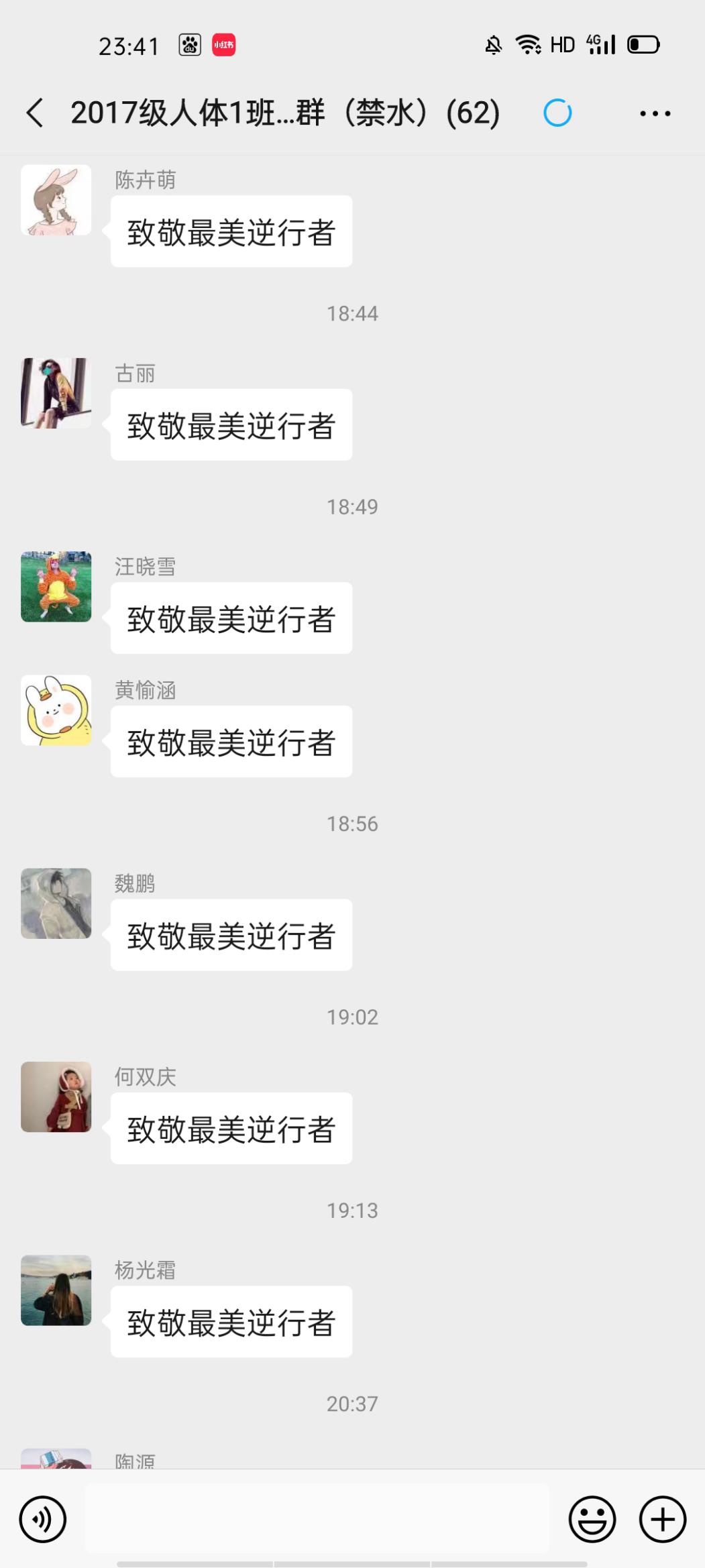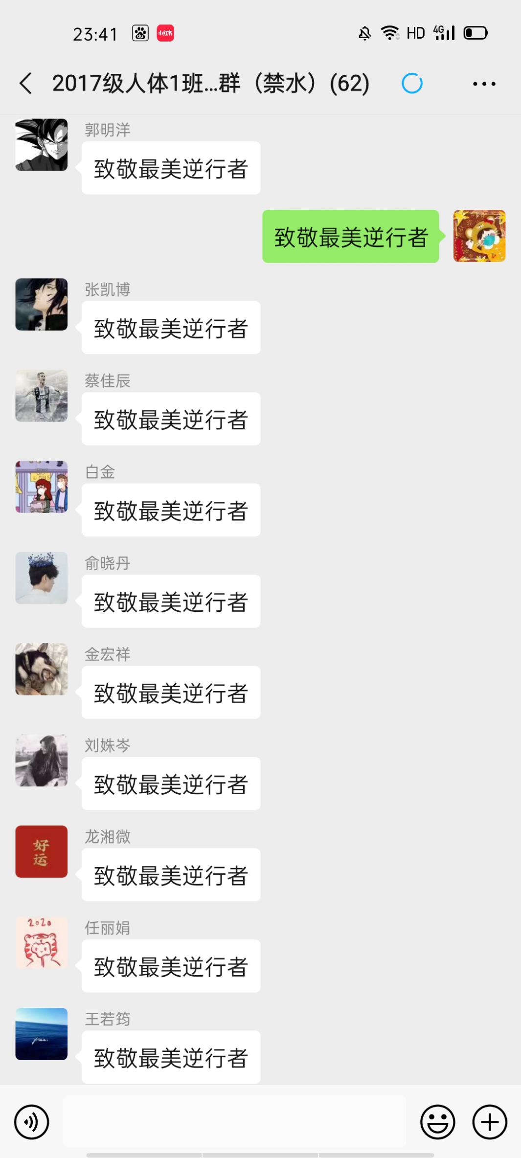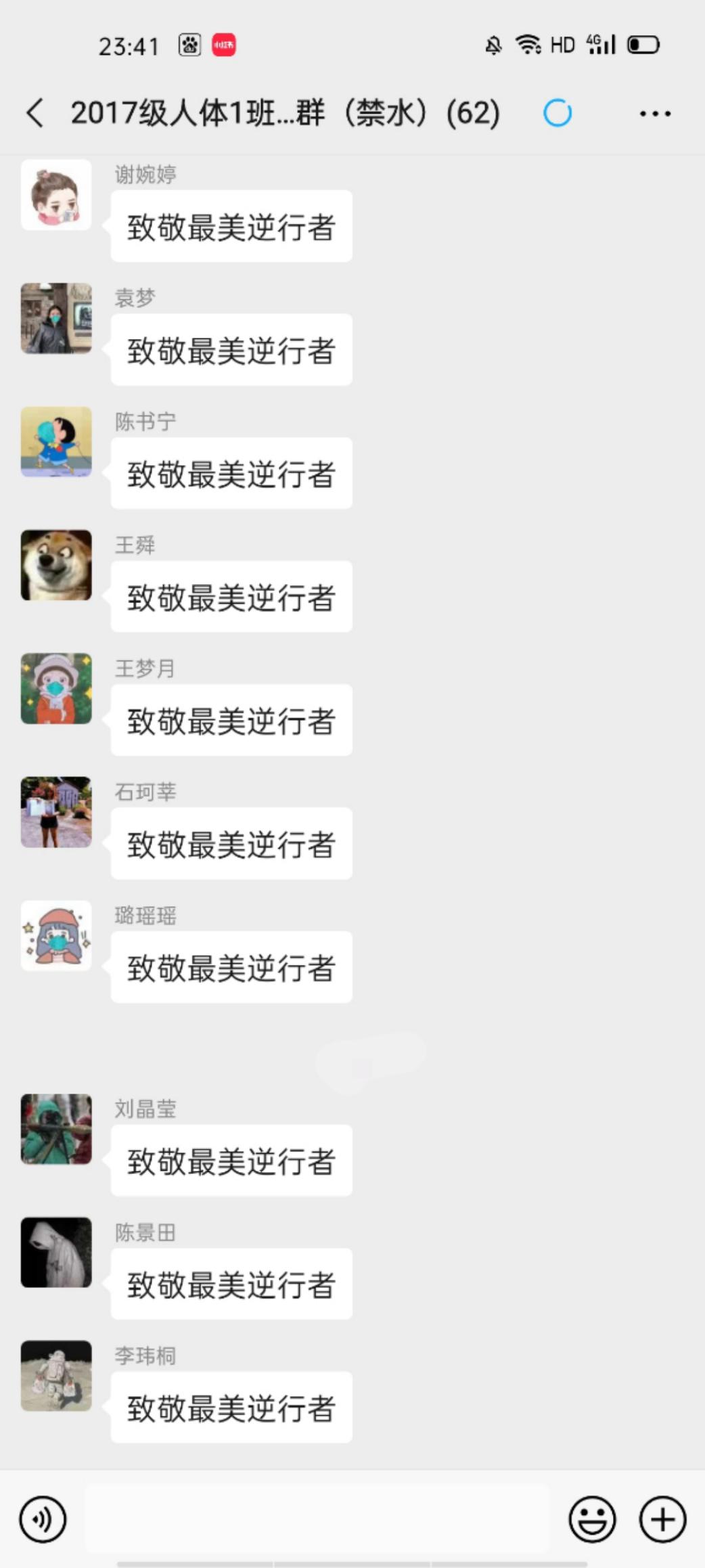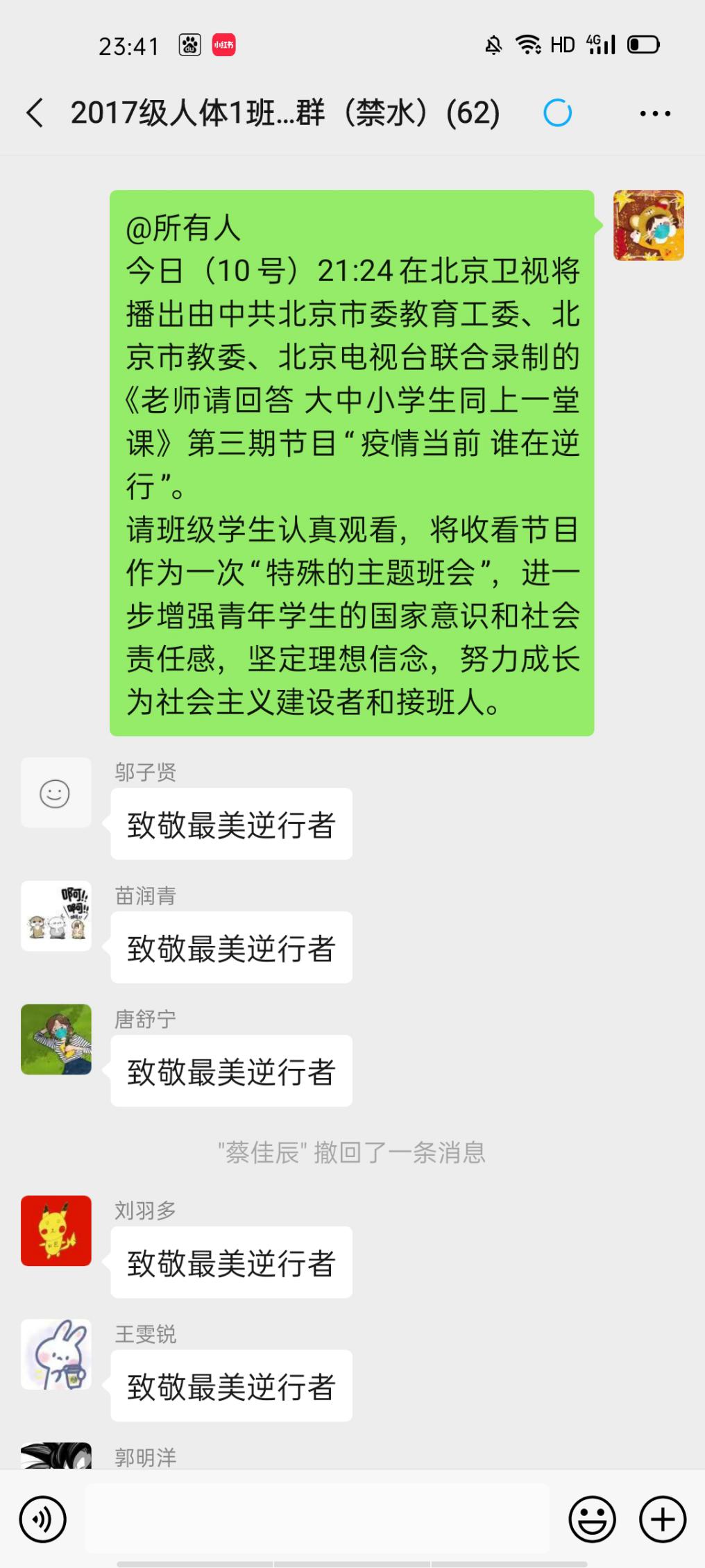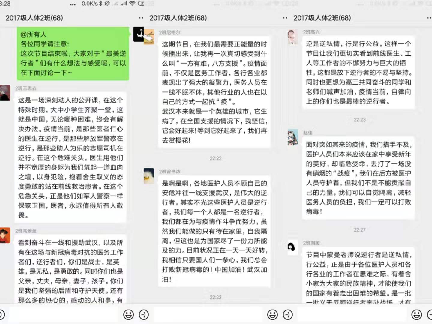 班级同学们积极参与班会活动,认真收看本期节目,受到勇赴抗疫一线“逆行者”们的使命感、家国情怀的触动,千里河山,心意项链,一方有难,八方支援。大家自发在群内接力回复“致敬最美逆行者”并交流感想,还有许多同学主动分享观看节目后内心最真实的感触,并表达战胜疫情的决心和对国家以及医护人员的信心。