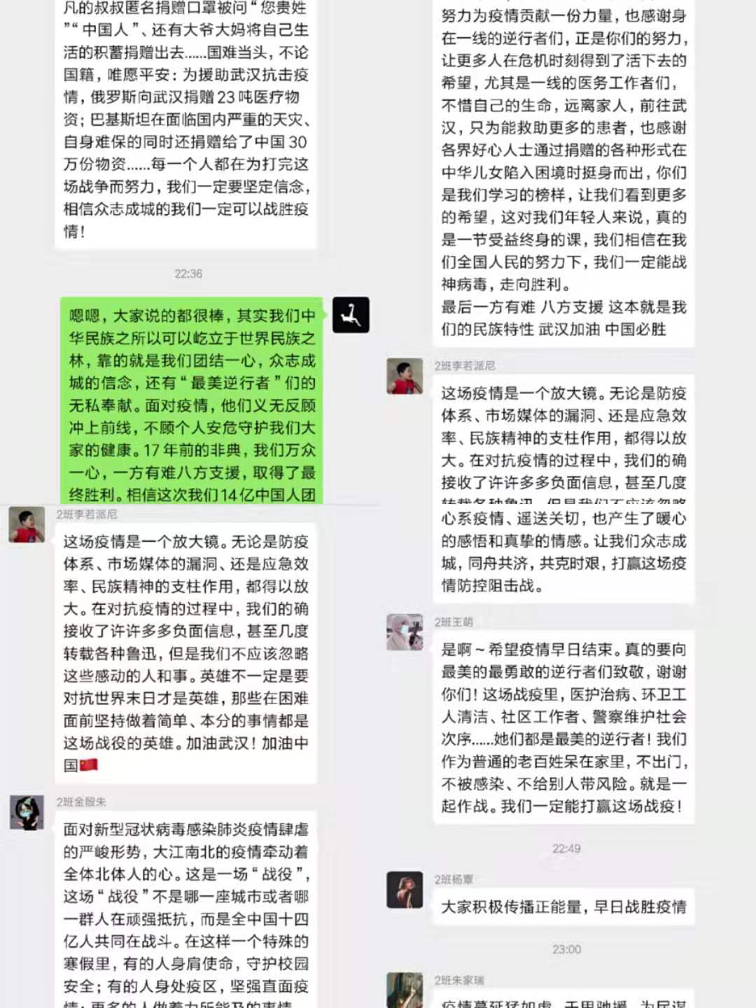 还有许多同学都发表了自己的感想,每位同学都在此次班会中收获了许多,表示要坚决做好自己分内的事情,不外出,勤洗手。相信通过大家的不懈努力,我们一定可以度过此次难关!