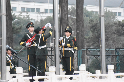 随着义勇军进行曲缓缓奏响,五星红旗在国旗班的手中缓缓升起,与之共同升起的是满满的民族自豪感。退伍军人代表、冬奥优秀志愿者的发言以及雄壮热血的朗诵活动更是激发了心中的爱国情怀。