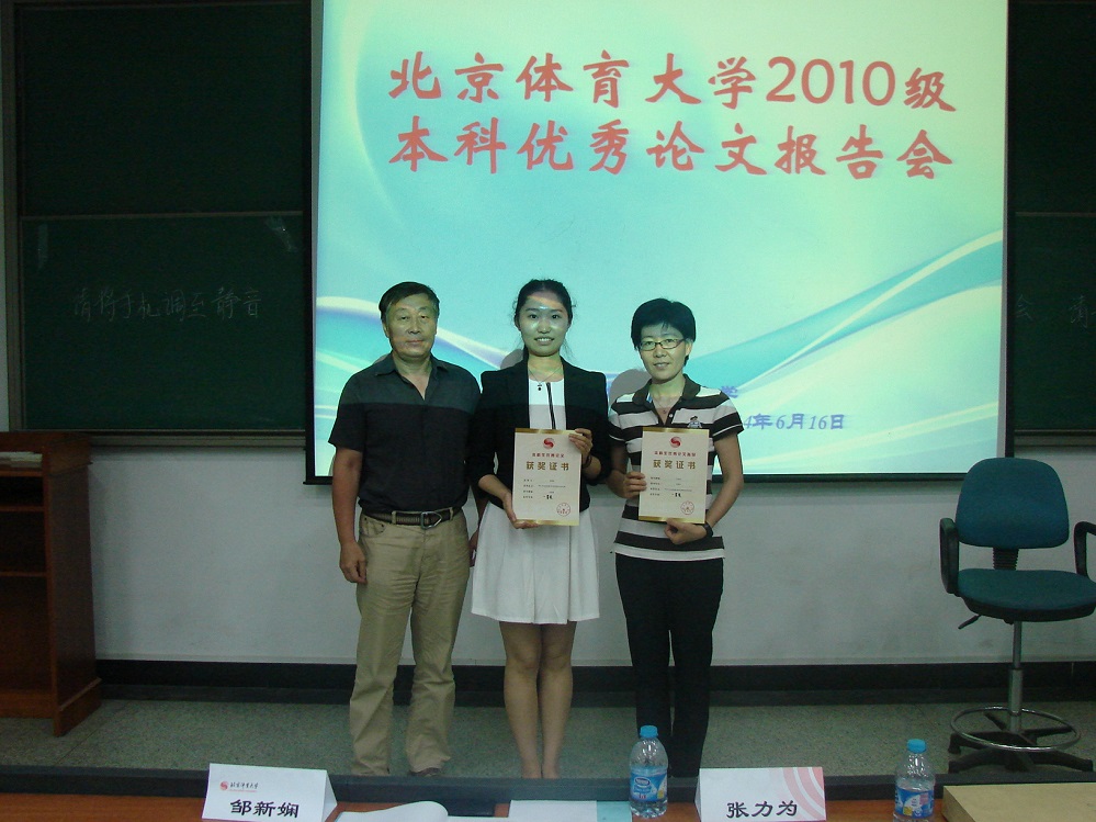taptap竞彩足球2014届本科生优秀论文报告会于6月16日晚7点在教学楼举办。我院运动人体科学专业张寒梦、戴思宇和应用心理学专业杜妍、周雪娇四位同学参加了本次报告会。经过精彩的报告与答辩,四位同学表现优异,分别获得了一、二、三等奖。通过此次活动,展现了我院学生较高的专业素质与研究能力以及严谨治学的态度和一丝不苟的学术氛围。希望越来越多的同学投身于体育科研,不断提高科研素质和科研能力,争取再创佳绩!